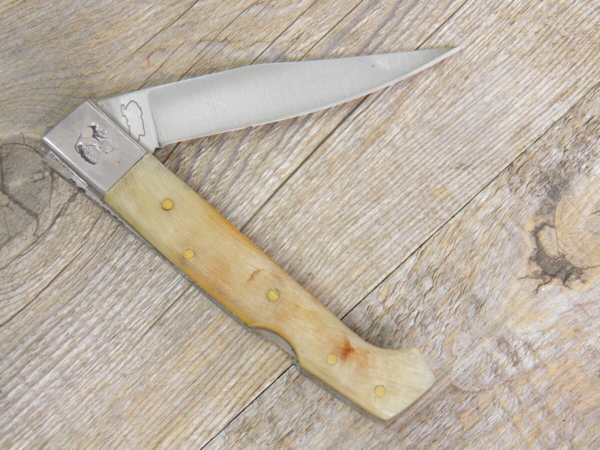 Cuchillo fabricado con diversos materiales, para la hoja y el mango, cuerno de buey o de muflón, hoja de carbono o damasco.
