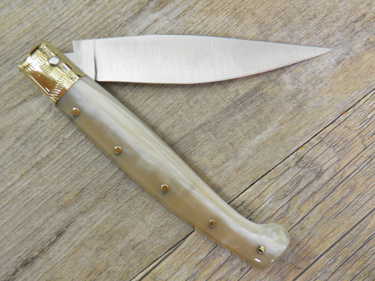 Cuchillo fabricado con diversos materiales, para la hoja y el mango, cuerno de buey o de muflón, hoja de carbono o damasco.