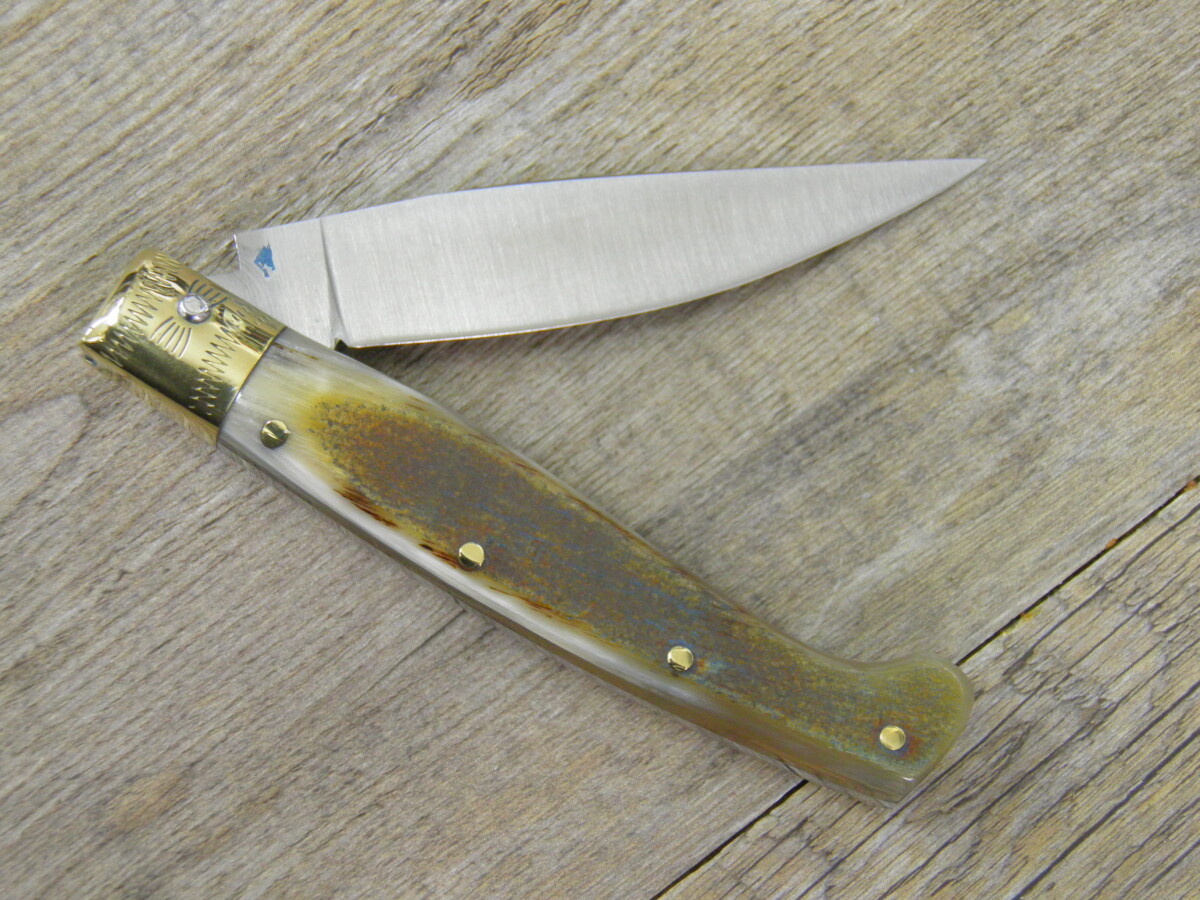 Cuchillo fabricado con diversos materiales, para la hoja y el mango, cuerno de buey o de muflón, hoja de carbono o damasco.