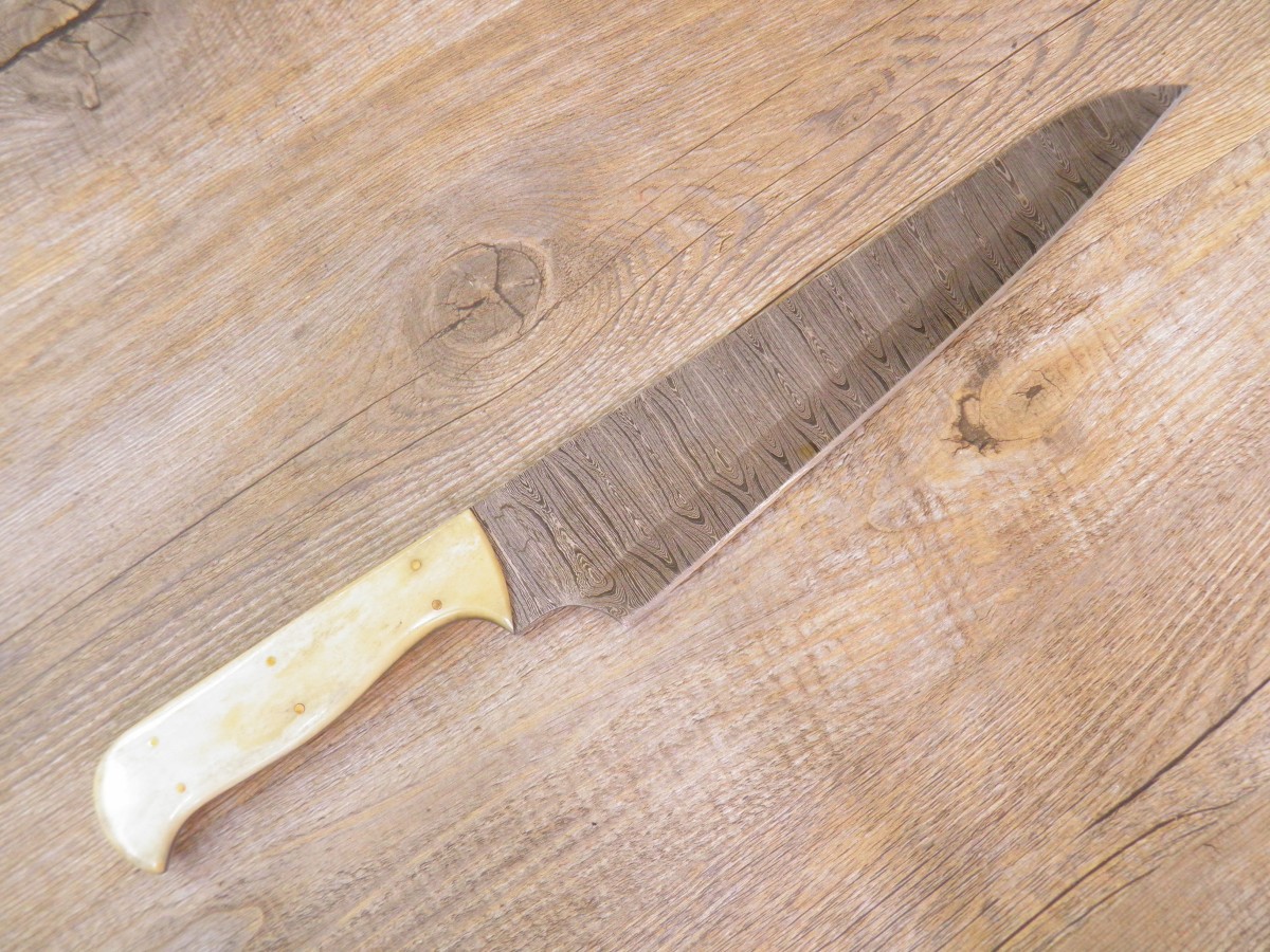 Cuchillo de cocinero Santoku con mango de cuerno y hoja de damasco