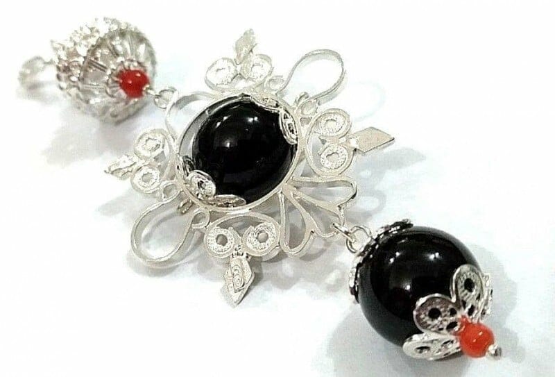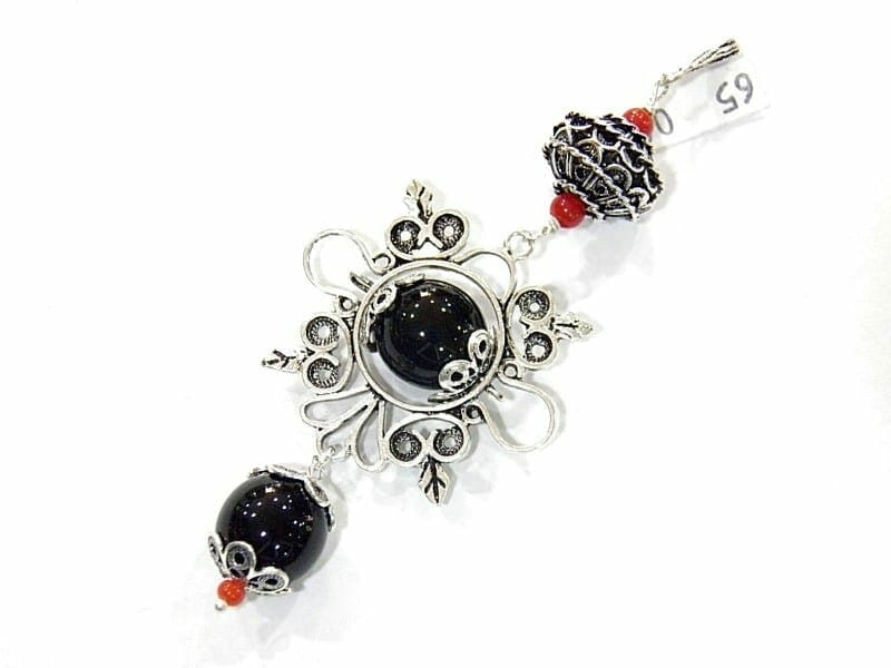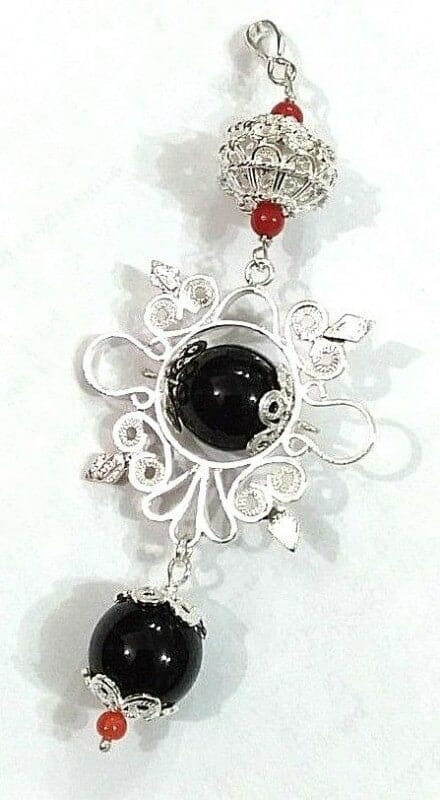 Pulsera Colgante amuleto de la suerte con esfera de ónice "Su Coccu" y perla decorativa. Una espléndida pieza de joyería artesanal de Cerdeña, elaborada con filigrana.