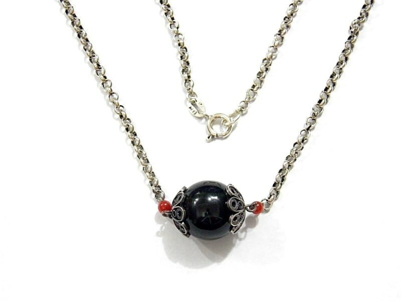 Pulsera Colgante amuleto de la suerte con esfera de ónice "Su Coccu" y perla decorativa. Una espléndida pieza de joyería artesanal de Cerdeña, elaborada con filigrana.
