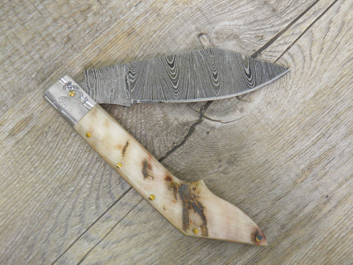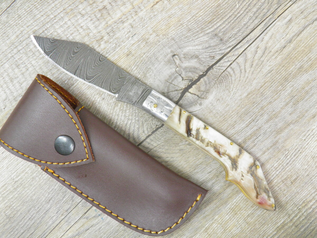 Coltello creato con vari materiali , per la lama e per il manico , corno di bue o di muflone , lama in cacciao o damasco.