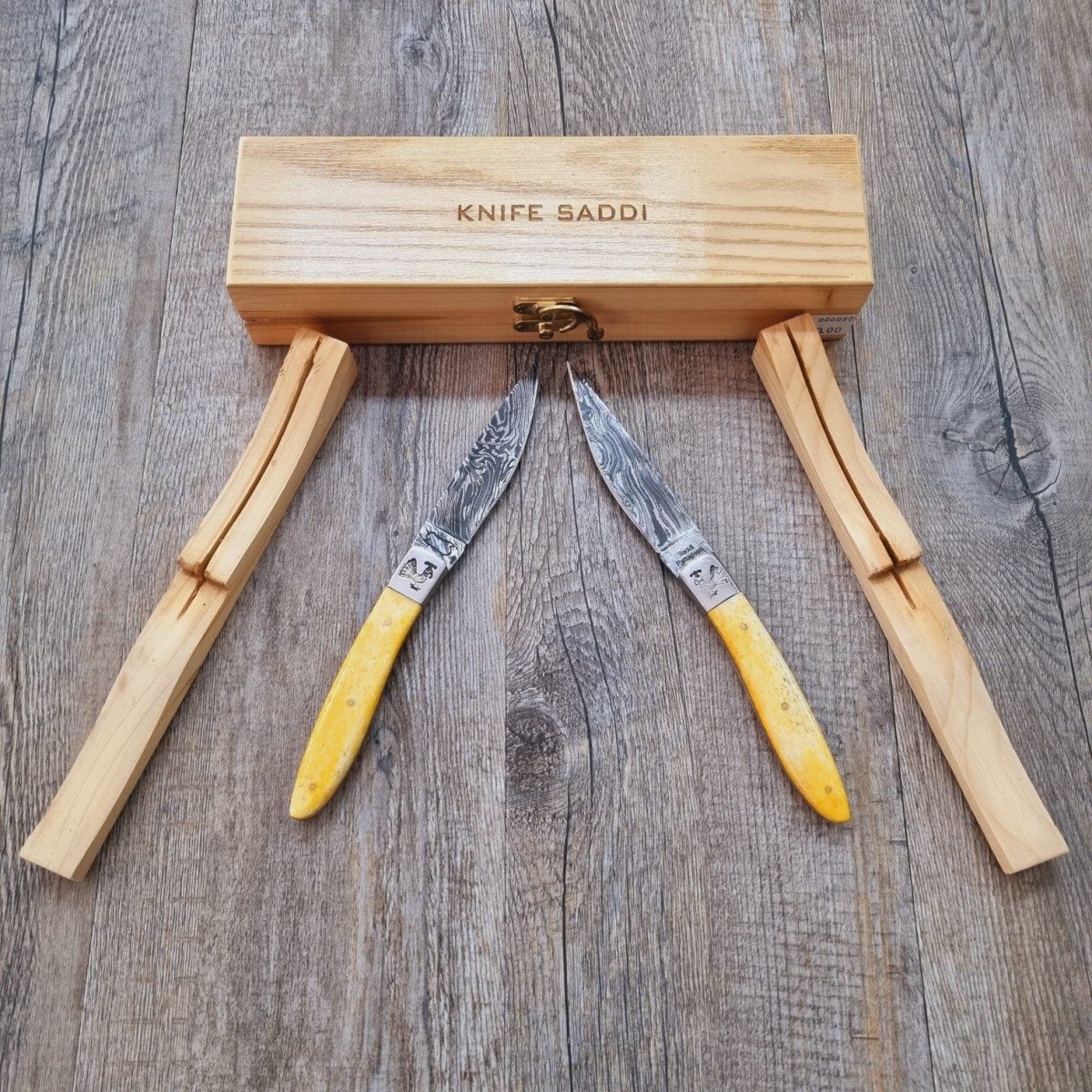 Set 2 Coltelli Pattada Da Tavola manico in tibia lama damasco con custodia in legno
