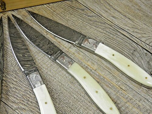 Set 6 Coltelli Pattada Da Tavola manico in tibia lama damasco con custodia in legno
