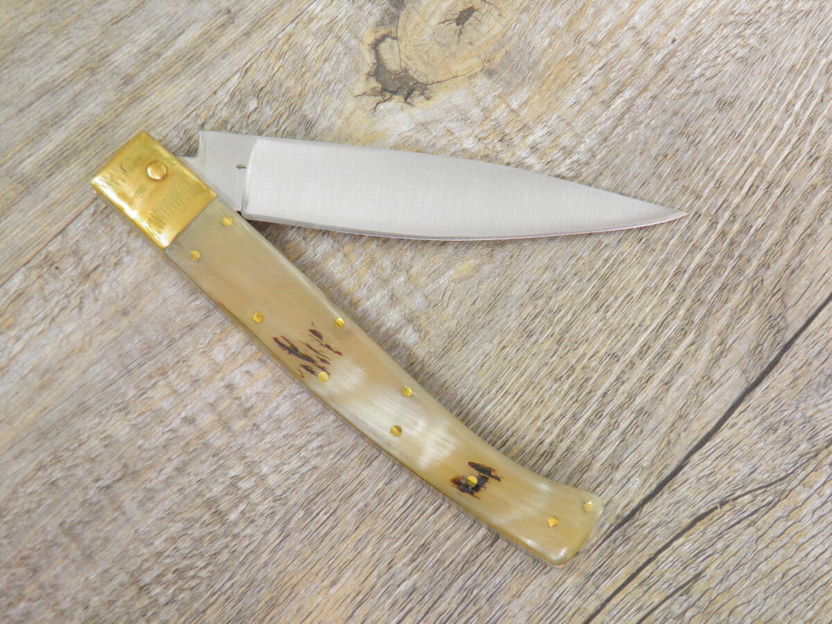 Coltello creato con vari materiali , per la lama e per il manico , corno di bue o di muflone , lama in cacciao al carbonio o damasco.