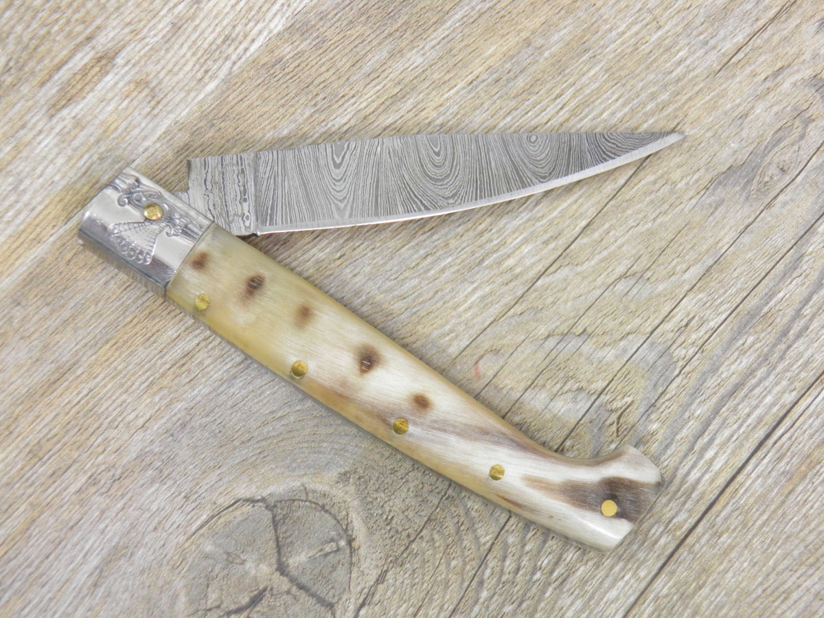 Coltello creato con vari materiali , per la lama e per il manico , corno di bue o di muflone , lama in cacciao al carbonio o damasco.